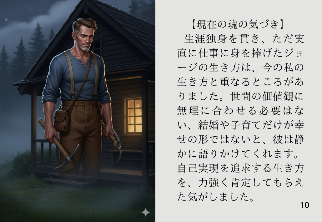 生涯を独身で過ごし、実直に仕事に身を捧げるジョージの生き方は、実際に私の現在とオーバラップしているところもあり、このまま自分が信じた道を歩み続けて良いんだと勇気づけられました。