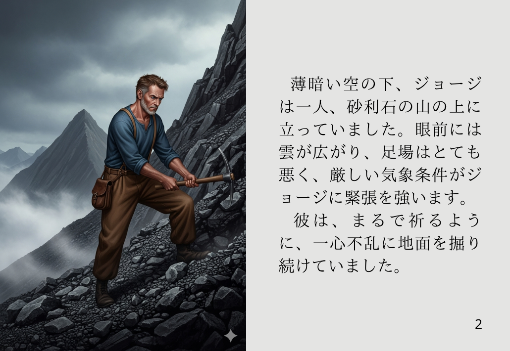 薄暗い空の下、ジョージは一人、砂利石の山の上に立っていました。眼前には雲が広がり、足場はとても悪く、厳しい気象条件がジョージに緊張を強います。彼は、まるで祈るように、一心不乱に地面を掘り続けていました。