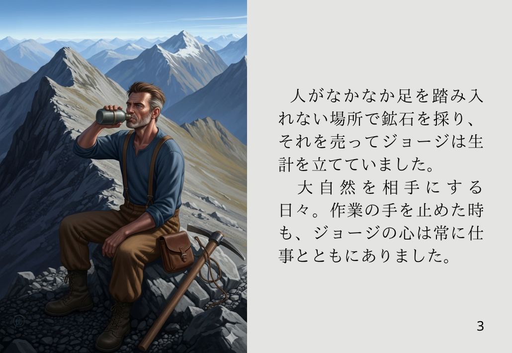 人がなかなか足を踏み入れない場所で鉱石を採り、それを売ってジョージは生計を立てていました。大自然を相手にする日々。作業の手を止めた時も、ジョージの心は常に仕事とともにありました。