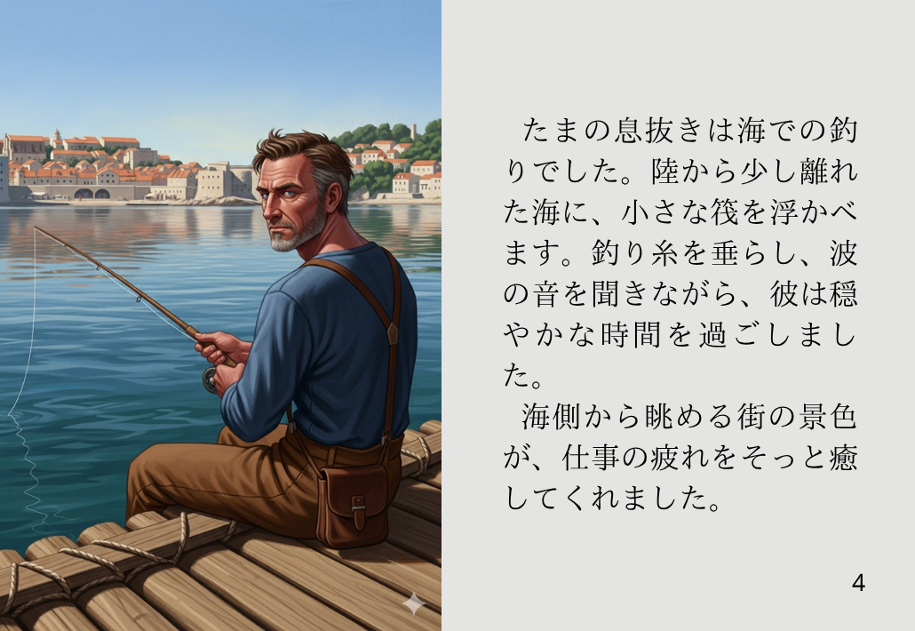 たまの息抜きは海での釣りでした。陸から少し離れた海に、小さな筏を浮かべます。釣り糸を垂らし、波の音を聞きながら、彼は穏やかな時間を過ごしました。海側から眺める街の景色が、仕事の疲れをそっと癒してくれました。