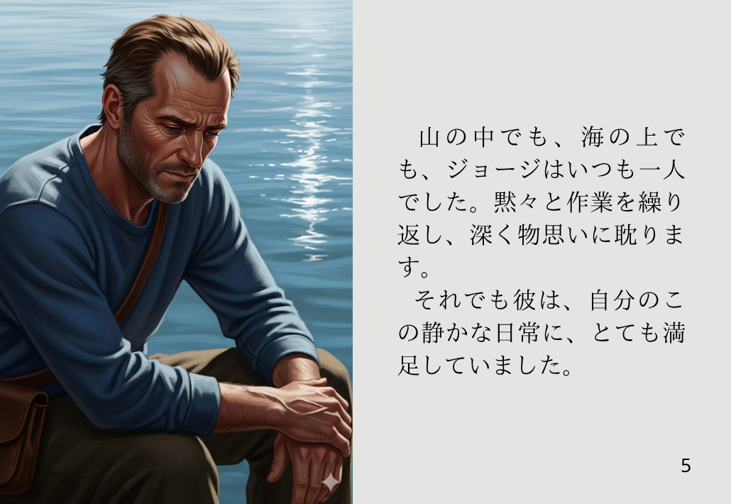 山の中でも、海の上でも、ジョージはいつも一人でした。黙々と作業を繰り返し、深く物思いに耽ります。それでも彼は、自分のこの静かな日常に、とても満足していました。