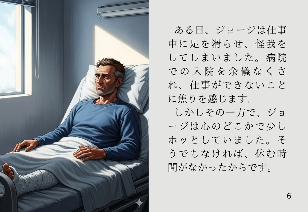 ある日、ジョージは仕事中に足を滑らせ、怪我をしてしまいました。病院での入院を余儀なくされ、仕事ができないことに焦りを感じます。しかしその一方で、ジョージは心のどこかで少しホッとしていました。そうでもなければ、休む時間がなかったからです。