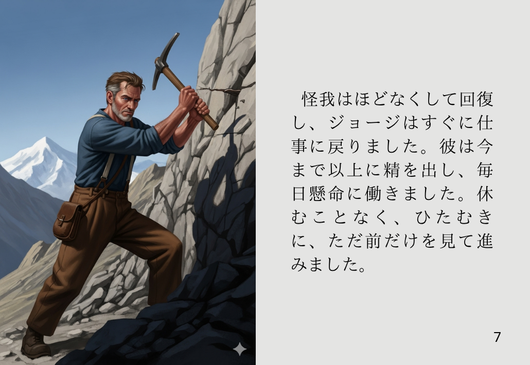 怪我はほどなくして回復し、ジョージはすぐに仕事に戻りました。彼は今まで以上に精を出し、毎日懸命に働きました。休むことなく、ひたむきに、ただ前だけを見て進みました。
