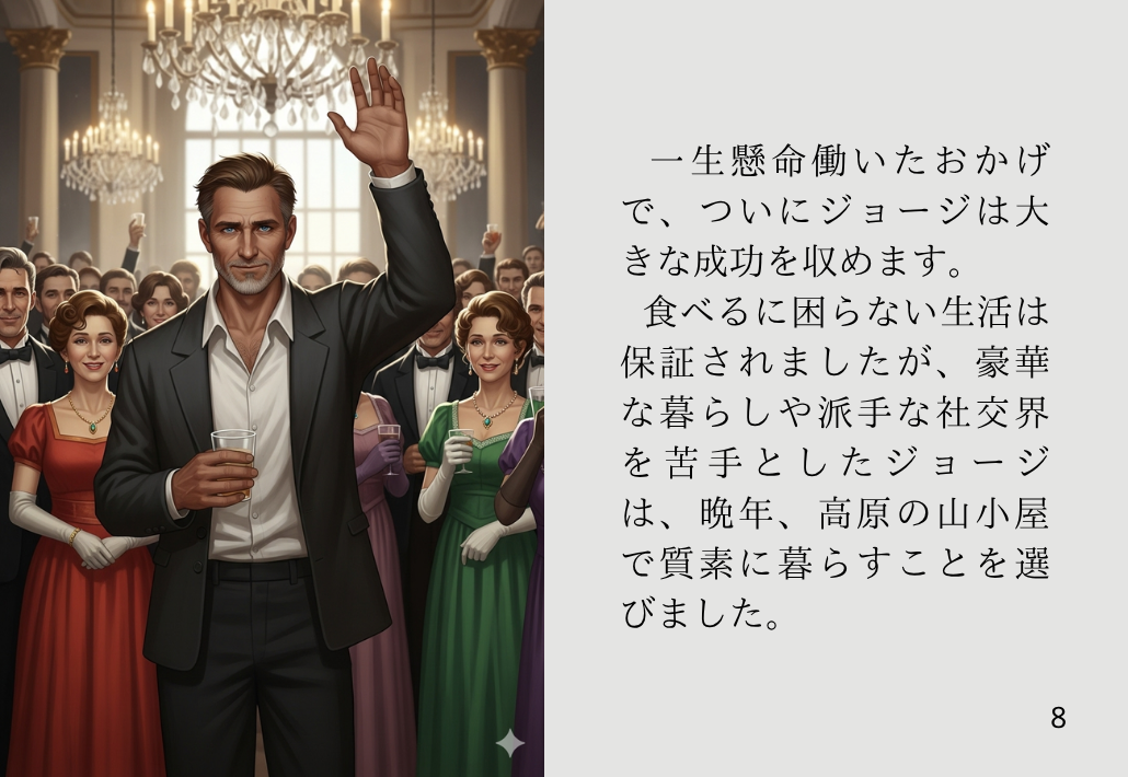 一生懸命働いたおかげで、ついにジョージは大きな成功を収めます。食べるに困らない生活は保証されましたが、豪華な暮らしや派手な社交界を苦手としたジョージは、晩年、高原の山小屋で質素に暮らすことを選びました。