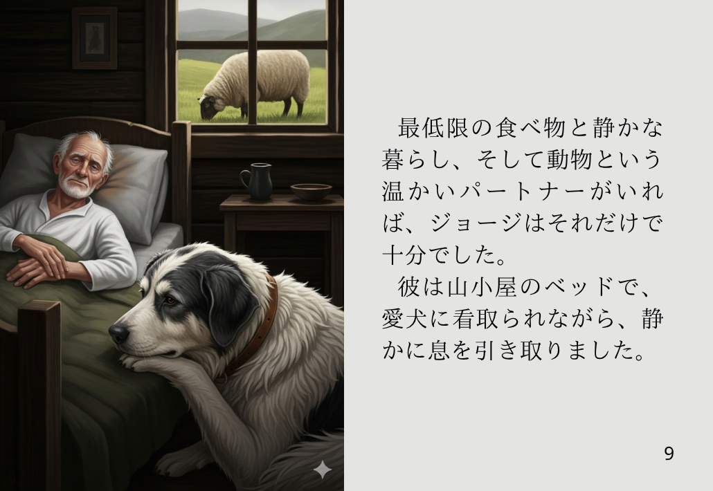 最低限の食べ物と静かな暮らし、そして動物という温かいパートナーがいれば、ジョージはそれだけで十分でした。彼は山小屋のベッドで、愛犬に看取られながら、静かに息を引き取りました。