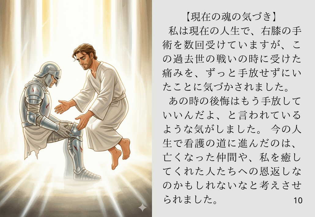 私は現在の人生で、右膝の手術を数回受けていますが、この過去世の戦いの時に受けた痛みを、ずっと手放せずにいたことに気づかされました。あの時の後悔はもう手放していいんだよ、と言われているような気がしました。今の人生で看護の道に進んだのは、亡くなった仲間や、私を癒してくれた人たちへの恩返しなのかもしれないなと考えさせられました。