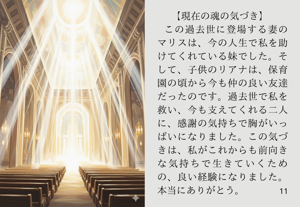この過去世に登場する妻のマリスは、今の人生で私を助けてくれている妹でした。そして、子供のリアナは、保育園の頃から今も仲の良い友達だったのです。過去世で私を救い、今も支えてくれる二人に、感謝の気持ちで胸がいっぱいになりました。この気づきは、私がこれからも前向きな気持ちで生きていくための、良い経験になりました。本当にありがとう。
