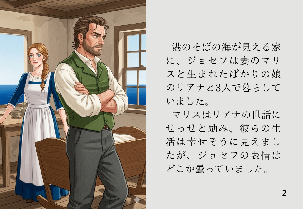 港のそばの海が見える家に、ジョセフは妻のマリスと生まれたばかりの娘のリアナと3人で暮らしていました。マリスはリアナの世話にせっせと励み、彼らの生活は幸せそうに見えましたが、ジョセフの表情はどこか曇っていました。