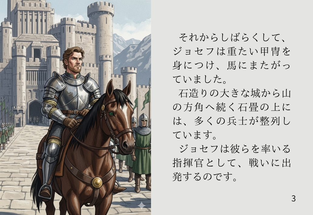 それからしばらくして、ジョセフは重たい甲冑を身につけ、馬にまたがっていました。石造りの大きな城から山の方角へ続く石畳の上には、多くの兵士が整列しています。ジョセフは彼らを率いる指揮官として、戦いに出発するのです。