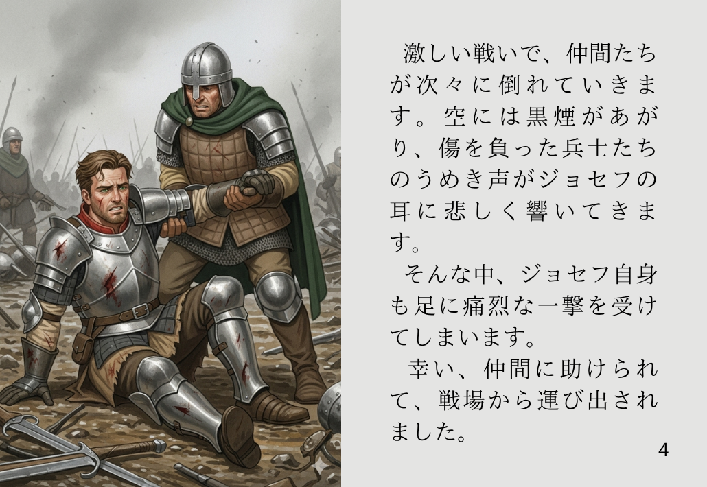 激しい戦いで、仲間たちが次々に倒れていきます。空には黒煙があがり、傷を負った兵士たちのうめき声がジョセフの耳に悲しく響いてきます。そんな中、ジョセフ自身も足に痛烈な一撃を受けてしまいます。幸い、仲間に助けられて、戦場から運び出されました。