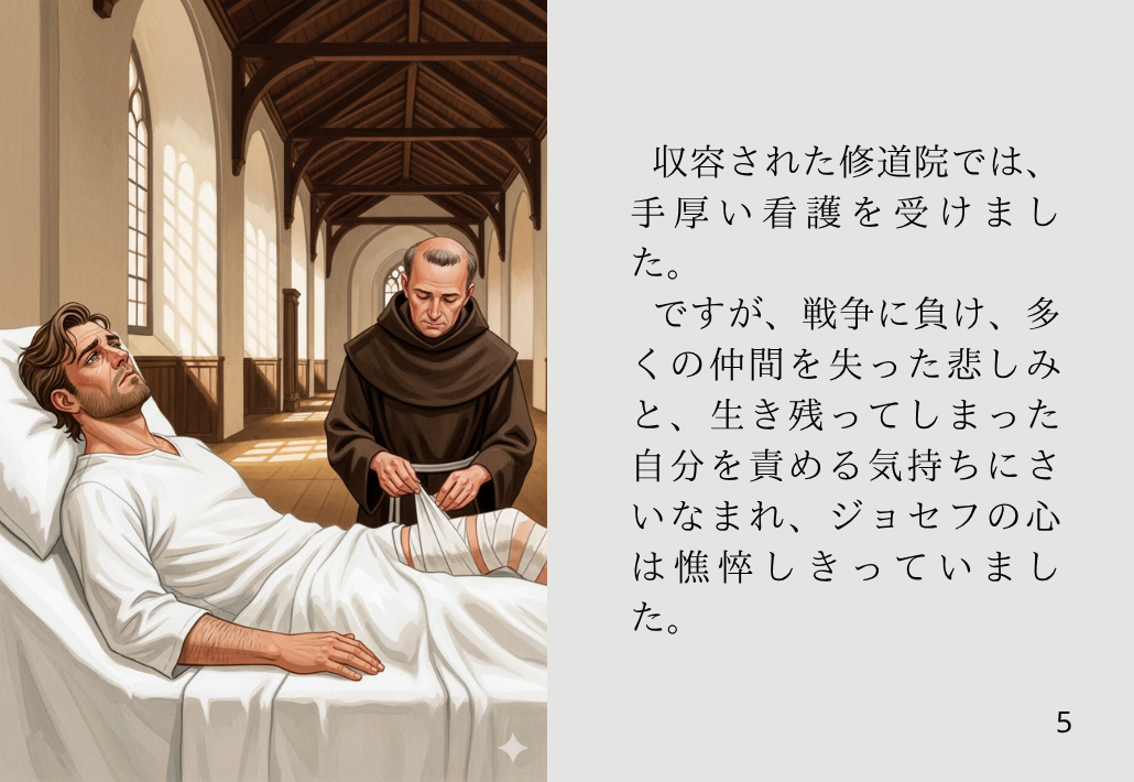 収容された修道院では、手厚い看護を受けました。ですが、戦争に負け、多くの仲間を失った悲しみと、生き残ってしまった自分を責める気持ちにさいなまれ、ジョセフの心は憔悴しきっていました。