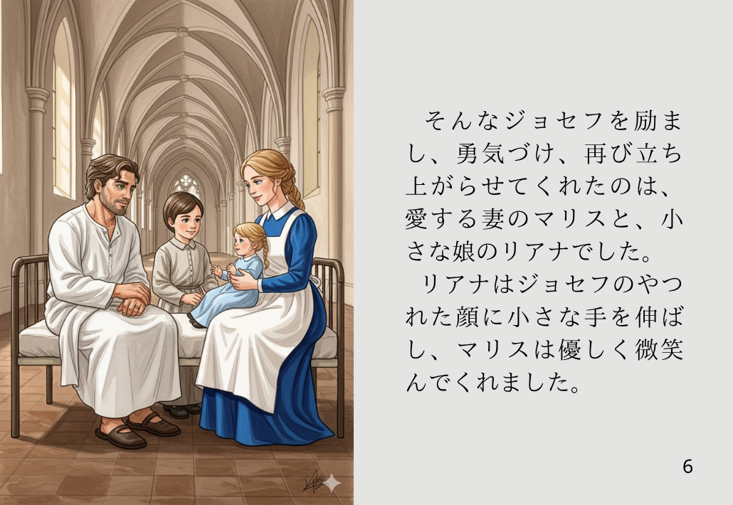 そんなジョセフを励まし、勇気づけ、再び立ち上がらせてくれたのは、愛する妻のマリスと、小さな娘のリアナでした。リアナはジョセフのやつれた顔に小さな手を伸ばし、マリスは優しく微笑んでくれました。