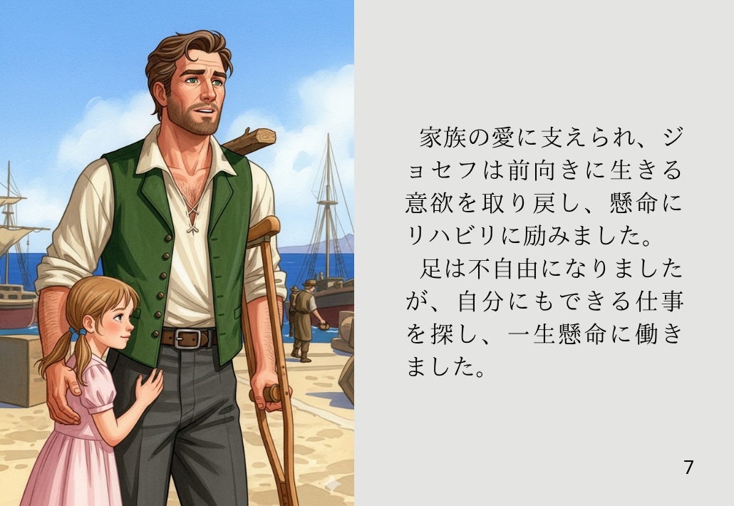 家族の愛に支えられ、ジョセフは前向きに生きる意欲を取り戻し、懸命にリハビリに励みました。足は不自由になりましたが、自分にもできる仕事を探し、一生懸命に働きました。