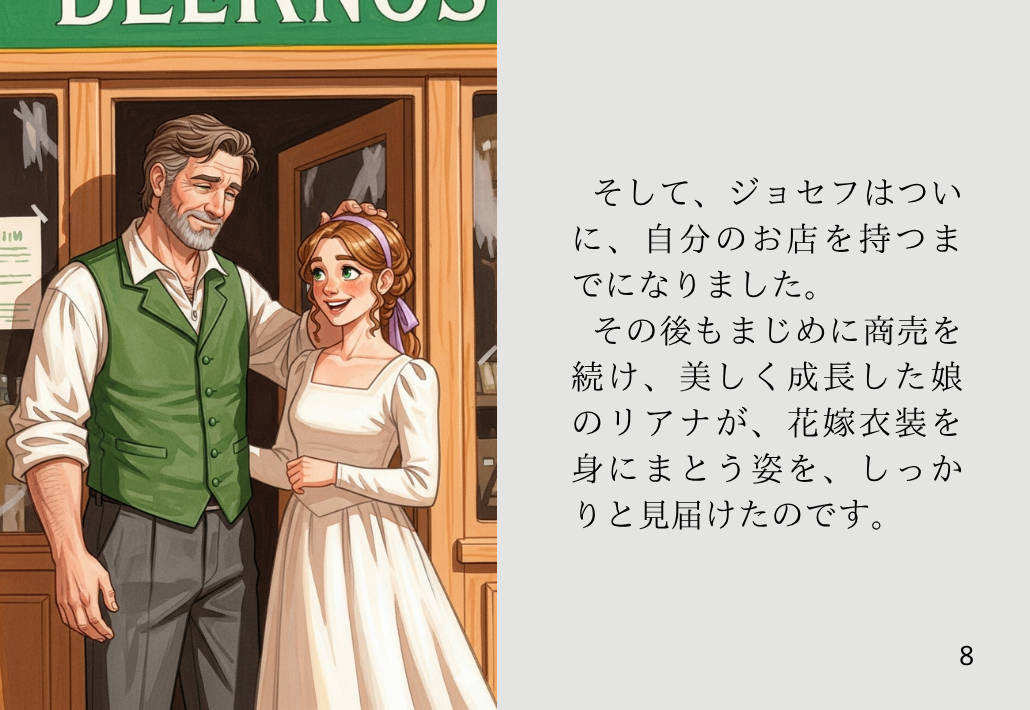 そして、ジョセフはついに、自分のお店を持つまでになりました。その後もまじめに商売を続け、美しく成長した娘のリアナが、花嫁衣装を身にまとう姿を、しっかりと見届けたのです。