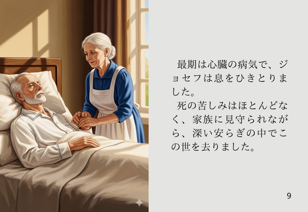 最期は心臓の病気で、ジョセフは息をひきとりました。死の苦しみはほとんどなく、家族に見守られながら、深い安らぎの中でこの世を去りました。